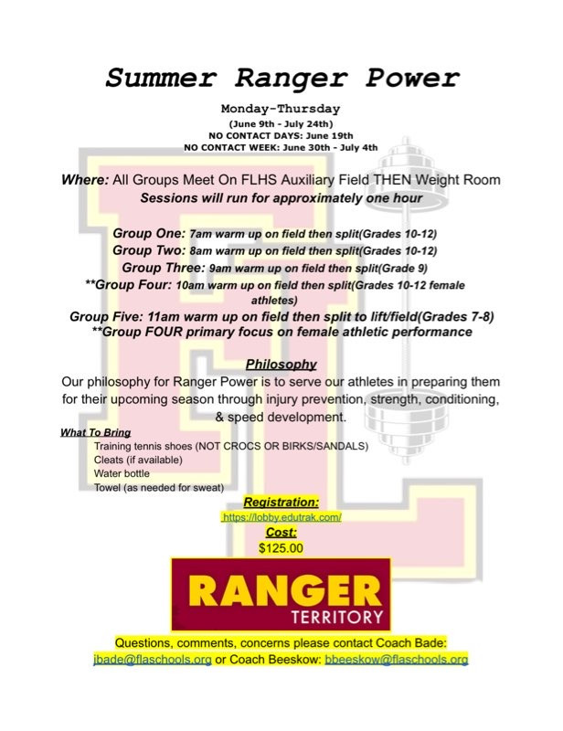 Summer Ranger Power Sign Up let’s get this summer rolling to a HOT start with Ranger power! we have multiple sessions and are beyond ready to take our athletes to the next level!